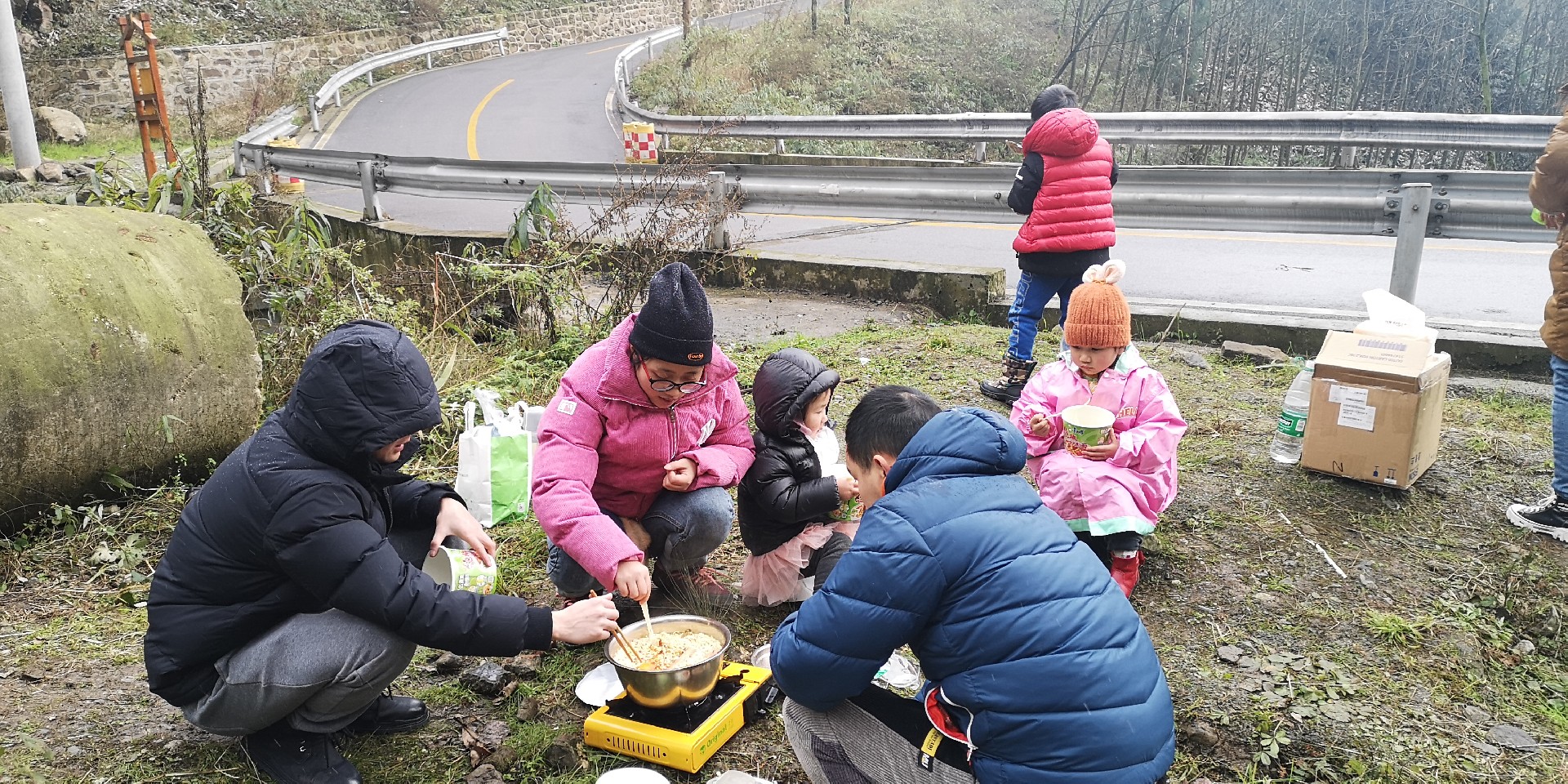 到了山脚后开始飘雪了,雪越飘越大,小朋友们可开心了。大朋友们开始寻找地方准备午餐,疫情期间,为了大家的安全,我们选择了空旷的无人的路边,用我们自带的瓦斯解决了大小朋友的午餐。我们都在自嘲,成都大好的太阳不晒,跑到这个地方来受冻、淋雪,体验雪中午餐,真的是自虐!是的,我们就是自虐!